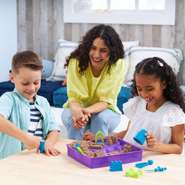 Experience the magic of the beach anywhere with the Deluxe Beach Castle Playset! This playset includes 2.5 lbs of Kinetic Beach Sand and everything you need to create epic sandcastles. Unfold the box to discover a sandy play space, perfect for building sandcastles both indoors and outdoors! Made with larger grains of natural sand, Kinetic Beach Sand provides a unique sensory experience. Utilize the 9 castle-themed molds on the Kinetic Sand two-tiered tray to build sandcastles, towers, walls, bridges, and more! Get ready to design your castle, your tools double as decorations for your castle. The 2 multi-use Kinetic Sand tools are perfect for cutting, digging, raking, and shoveling your moldable sand. Cleaning up is a breeze! Kinetic sand sticks to itself for easy clean-up. The Deluxe Beach Castle Playset comes with a lid for easy storage. Close it up and store to use again and again for even more fun! More engaging than arts and crafts modeling clay, this magic sand molds effortlessly and never dries out, allowing for hours of independent play. Not only is the playset a great alternative to arts and crafts modeling clay, but it’s also a great addition to your craft table, kids activities time and Montessori toys! Perfect cool toys for girls and boys to encourage independent and imagination building. For more Kinetic Sand fun, refill your Kinetic Sand playset with the 2.5 lbs Kinetic Sand bulk bags of colored sand (sold separately)! Bring the excitement of the beach home and build your own sandcastles with the Kinetic Sand Beach Sand Kingdom!
